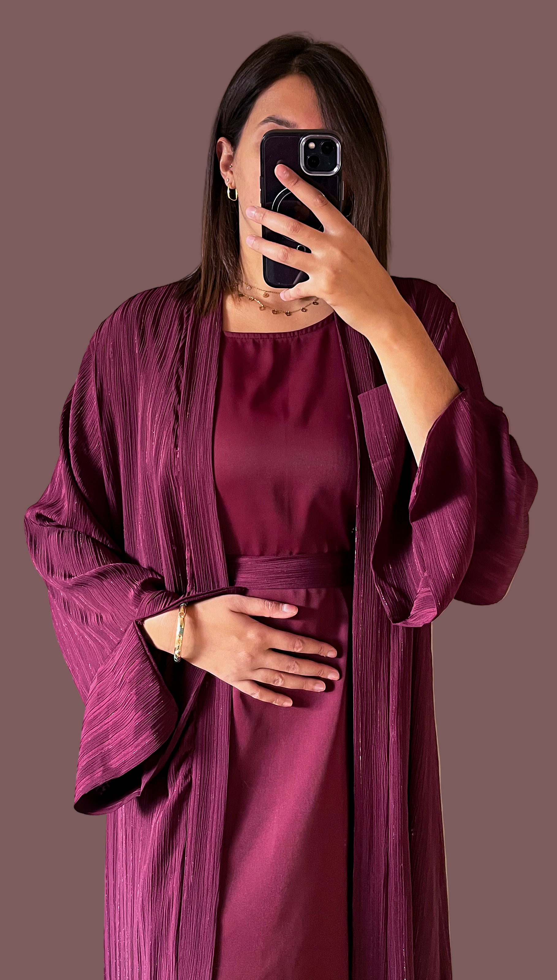 Illuminez votre style avec cette abaya kimono bordeaux et lumineuse, à la fois douce et raffinée. Confectionnée dans un tissu fluide et respirant, elle assure un confort optimal tout au long de la journée. Sa coupe ouverte et ses manches amples offrent liberté et élégance en toute occasion.